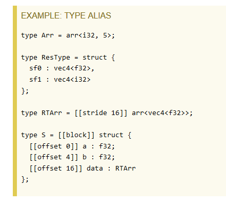 i32, u32, f32, bool@builtin(vertex_index), @builtin(position)vec2f === vec2<f32>vec3u === vec3<u32>vec4i === vec4<i32>mat2x3<f32> === mat2x3f (row x column)array<f32,5>, c must be const-declared.@group(0) @binding(0) var<storage> weights: array<f32>;arrayLength() builtin function to get the element count.struct VertexOutput {